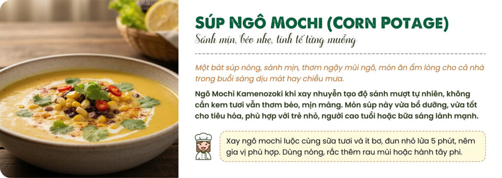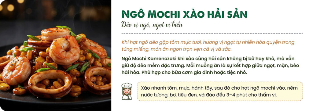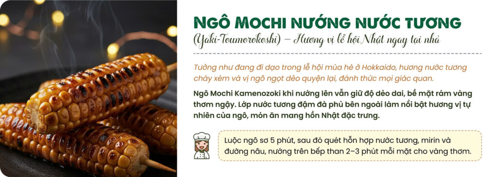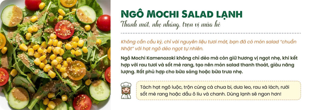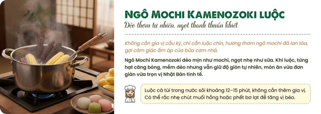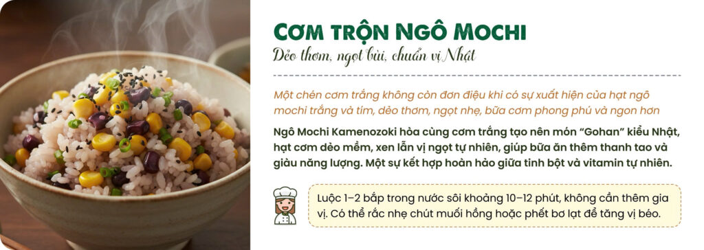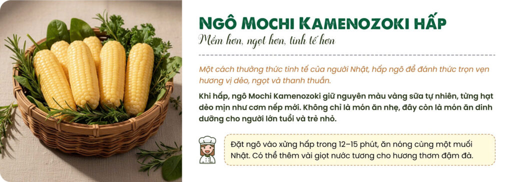 Ngô Mochi Kame Nozoki không chỉ là một món ăn, mà là nguyên liệu mở ra vô vàn cảm hứng ẩm thực. Từ những cách chế biến đơn giản như hấp, nướng cho đến salad thanh mát hay món chay tinh tế, mỗi cách nấu đều tôn vinh trọn vẹn độ dẻo mềm, vị ngọt thanh và hương thơm thuần tự nhiên của giống ngô nếp Nhật Bản cao cấp.