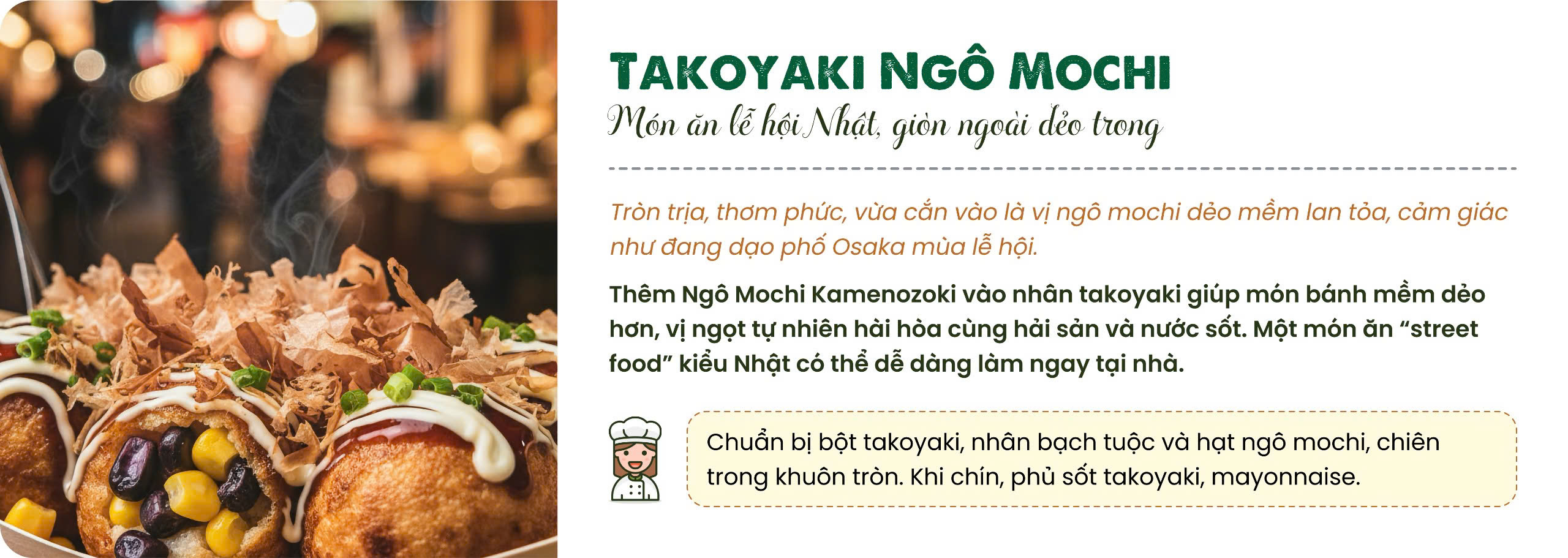 - Bánh Mochi Nhân Ngô: Dùng ngô xay nhuyễn làm nhân cho bánh mochi, mang đậm phong cách Nhật Bản.